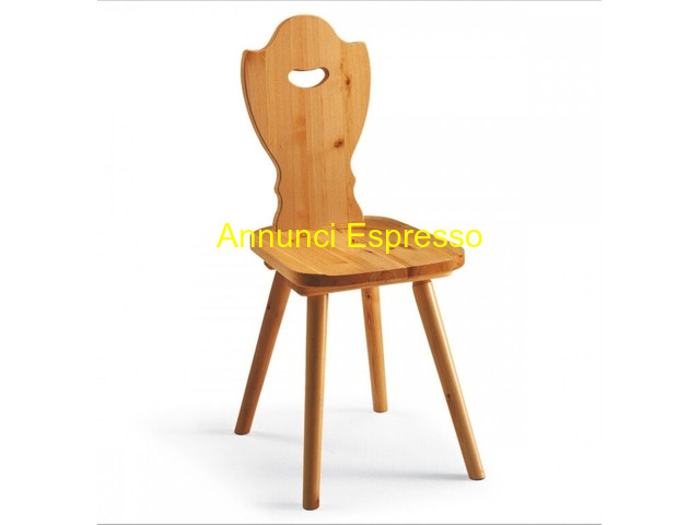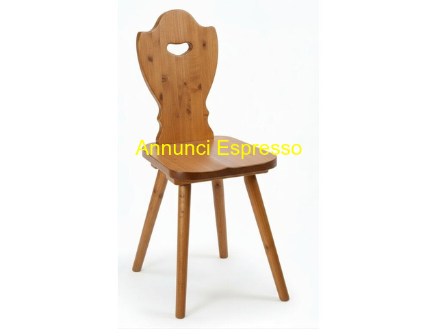 Sedie tirolesi in pino grezzo per baite e rifugi prezzo EUR.95,00 Sedia in legno massello con schienale intagliato, design rustico, gambe coniche. Adatta per interni ed esterni. Ideale per arredo taverna o giardino. Materiale resistente e duraturo. Aosta (AO)