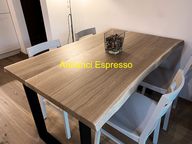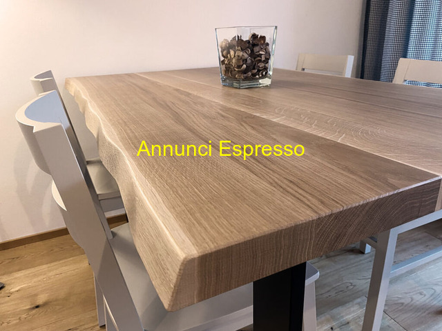 tavolo rovere con supporto metallo prezzo EUR.1.750,00 Tavolo artigianale con piano in rovere massello da 4 cm di spessore, verniciato naturale e spazzolato, con sagomatura lungo i due lati lunghi del perimetro. Dimensione cm 140x90. Gambe in metallo verniciato nero Trento (TN)