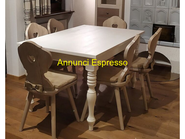 tavolo tabià con sedie cortina prezzo EUR.2.600,00 N. 1 Tavolo fisso modello Tabià, in abete massello dimensione cm 140x90, finitura di colore Bianco Perla spazzolato e talcato N. 6 Sedie modello Cortina con seduta legno, in abete massello, finitura di colore Nocciola spazzolato e talcato Trento (TN)