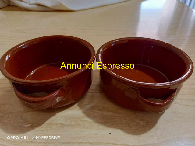 TEGLIE TERRINE IN TERRACOTTA prezzo EUR.15,00 PIROFILA OVALE IN TERRACOTTA SMALTATA CM. 27, 5 X 14, 5 X 5 PEZZI 4 IN TOTALE PEZZI 3 MARRONE CHIARO PEZZI 1 MARRONE PIU' SCURO PESO TOTALE KG. 2, 360 TEGAMI IN TERRACOTTA TONDI CON MANICI CM. 14/16 X 6 IN TERRACOTTA SMALTATA PEZZI 2 VENDO IN BLOCCO SONO DISPONIBILE PER INF. FOTO POSSIBILE SPEDIZIONE Matera (MT)