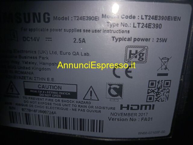 Tv samsung schermo rotto il resto perfetto Samsung prezzo EUR.40,00 Tv samsung schermo rotto il resto perfettamente funzionante modello e etichetta in foto Samsung modello LT24E390, alimentazione DC 14V, potenza 25W. Verdello (BG)