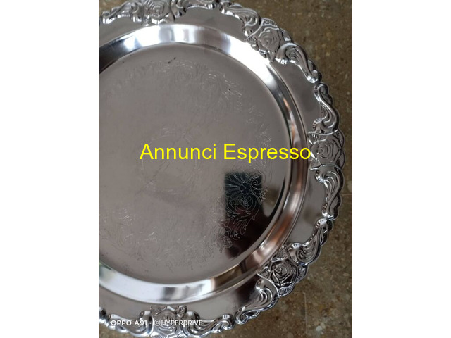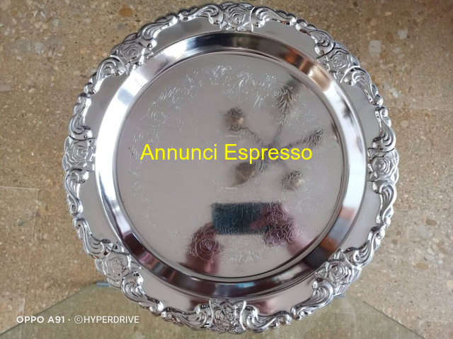 VASSOIO TONDO DECORATO prezzo EUR.23,00 VASSOIO IN METALLO COLORE ARGENTO MISURE CM. 35, 5 X 2 PRESENTI ALCUNI GRAFFI SONO DISPONIBILE PER INF. FOTO POSSIBILE SPEDIZIONE Matera (MT)