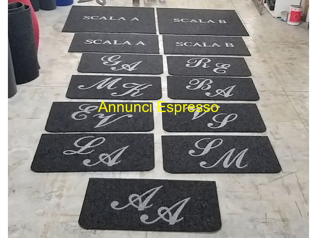 Zerbini personalizzati ad intarsio prezzo EUR.50,00 ( ([NUM])Tappeti da ingresso personalizzati in materiale sintetico, colori scuri, con scritte in bianco. Vari modelli disponibili con lettere e design differenti. Adatti per uso interno o esterno. Facili da pulire e resistenti. Ottimo per personalizzare l'entrata di una casa o un ufficio. Somma Vesuviana (NA)