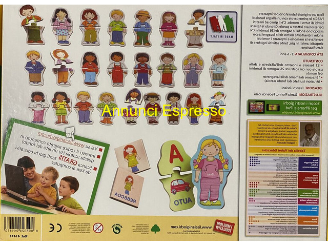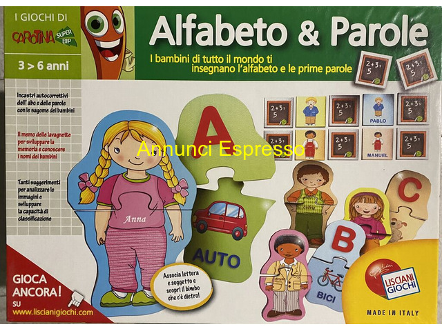 Alfabetò e parole gioco per bimbi Fascia di età 3-6 anni prezzo EUR.10,00 Gioco educativo "Alfabeto & Parole" per bambini dai 3 ai 6 anni. Include lettere, immagini e schede per imparare l'alfabeto e le prime parole. Rivello (PZ)