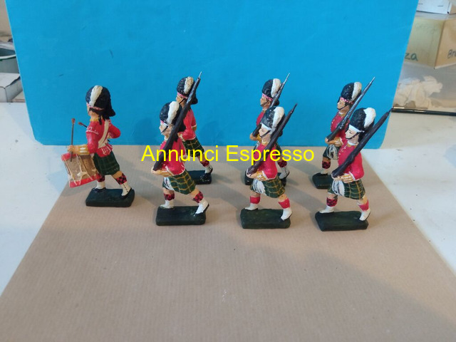 Soldatini scozzesi in parata prezzo EUR.50,00 I soldatini sono in gesso autocostruiti nello stile dei figurini in pasta degli anni '40 - '60 e sono alti 9 cm compreso il piedistallo. Terrasini (PA)