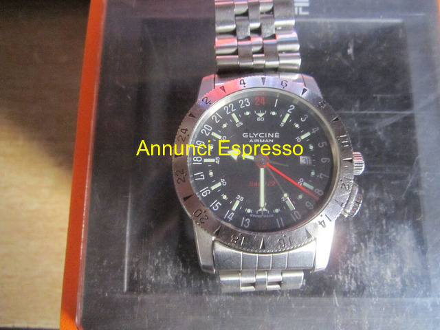 OROLOGIO-GLYCINE-ARMAN-BASE 22 REF-3887-AUTOMATICO prezzo EUR.430,00 Glycine Airman Base 22 ref. 3887 Orologio con bracciale in acciaio. Cassa in acciaio lucido di 42 millimetri ?impermeabile fino a 20 atmosfere rotonda con lunetta esterna e indicazione delle 24 ore. Fondello trasparente a vite. Corona firmata. Quadrante nero con indicazione delle 24 ore. Finestra della data a ore 3. Movimento automatico Glycine (base ETA 2893-riserva carica di 42 ore ). 3 fusi orari -Bracciale originale in acciaio con chiusura pieghevole firmata. Diametro: 41 mm Lunghezza: 22 mm L OROLOGIO FUNZIONA OTTIMAMENTE PRESENTA QUALCHE MICROGRAFFIETTI SULLA CASSA ACCIAO VETRO OK -E MANCANTE DI SCATOLA E ISTRUZIONE IL PREZZO E DI 450 EURO INTRATTABILE ?. N. B---N. B. . . N. B. . . N. B. . . EVITATE OFFERTE A RIBASSO E SCAMBI PER ULTERIORI INFORMAZIONI RISPONDO SOLO A CONTATTO TELEFONICO AL [NUM] funzionalità GMT, in confezione originale. Usato, buone condizioni. Gragnano (NA)