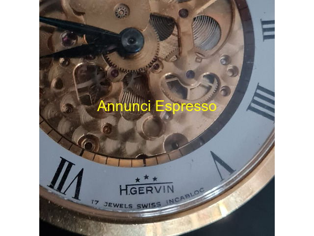 Orologio vintage da tasca H. GERVIN scheletrato prezzo EUR.138,00 Orologio vintage da tasca H. GERVIN scheletrato 17 Jewels Swiss made Incabloc , dimensioni diametro cm . 4, 5 spessore cm . 0, 5 perfettamente funzionante . Non spedisco . Vendo a ? 138. Gradito contatto telefonico wapp . [NUM] Lodi (LO)