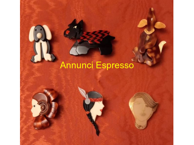 Spille di Lea Stein Paris vintage prezzo EUR.68,00 Spille di Léa Stein Paris vintage mai indossate , realizzate in acetato di celluloide laminato . Pubblcate sul volume edito dal comune di Casalmaggiore museo del Bijou mostra 19 ottobre [NUM] febbraio 2020. Marchio visibile sul retro della spilla come da foto . Vendo ? 68 cadauna . Gradito contatto telefonico [NUM] Lodi (LO)