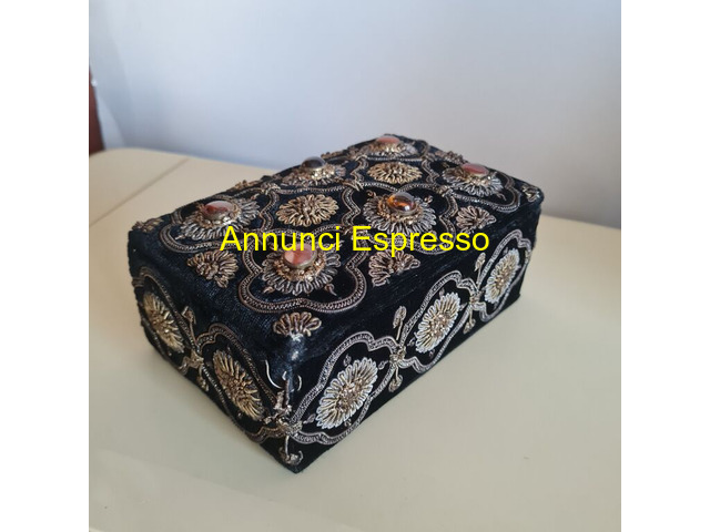 Antico portagioie anglo-indiano in velluto cin prezzo EUR.118,00 Antico portagioie anglo-indiano in velluto cinigliato nero con ricami in filo dorato e perle di corniola e ambra dimensioni c. m . 15x9x6 . Ottime condizioni . Vendo a ? 118. Gradito contatto telefonico wapp . [NUM] Scatola decorativa in tessuto nero, ricoperta di perline e motivi floreali. Ottima per riporre gioielli o piccoli oggetti. Dimensioni compatte, elegante e artigianale. Lodi (LO)