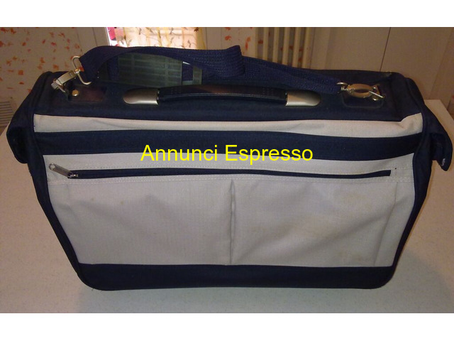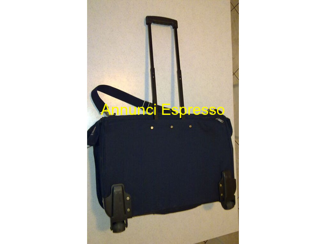 Borsa da viaggio trolley per non spiegazzare vest prezzo EUR.30,00 Borsa da viaggio trolley per non spiegazzare vestiti possibilit? di agganciare molto capiente ed al contempo compatta, fornita di moltissimi scomparti, di cui 1 staccabile, gancio interno per stampella ed esterno robusta e maneggevole, dotata di rotelle per un facile trasporto, Peso a vuoto Kg 3, 4 Dimensioni : H = altezza cm 43 L = larghezza cm 55 P = profondit? cm 18 . ritiro su Grosseto o spedizione Borsa da trasporto, colore blu e grigio, con manico e tracolla, zip frontale, ampia capacit?. Grosseto (GR)