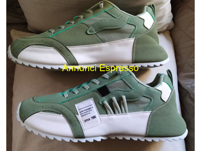 SNEAKER N. 43 /44 NUOVE, STILE SPORTIVO E CASUAL prezzo EUR.20,00 *** HO ORDINATO QUESTE SNEAKER N. 43 MA SONO MOLTO GRANDI - SONO ASSOLUTAMENTE NUOVE, SONO STATE SOLAMENTE PROVATE - QUESTE SNEAKER PRESENTANO UNA COMBINAZIONE DI COLORI VERDE CHIARO E BIANCO, STILE SPORTIVO E CASUAL - LA TOMAIA È REALIZZATA IN UN MIX DI PELLE SCAMOSCIATA GARANTENDO RESISTENZA E COMFORT - LA SPESSA SUOLA IN GOMMA BIANCA GARANTISCE UN'ADERENZA ECCELLENTE, RENDENDOLE PERFETTE PER L'USO QUOTIDIANO E SPORTIVO *** VENDITA: 20 EURO (non trattabili) - PROVA E RITIRO A GENOVA - VIA CAGLIARI [NUM] - GENOVA (ZONA MARASSI) *** Scarpe moderne, colore verde con dettagli bianchi. Realizzate in materiale sintetico e tessuto. Ideali per uso quotidiano e sportivo. Genova (GE)