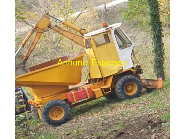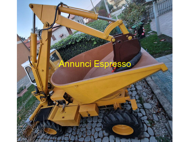Caricatore-escavatore altro Dumper Longhini DHH-M prezzo EUR.25.000,00 Dumper-Escavatore Longhini DHHM. Macchina operatrice 4 marcie più 4 ridotte. Trazione su 2 o 4 ruote selezionabile, bloccaggio differenziale. Motore LOMBARDINI 5LD 676-3 4TEMPI 3CILINDRI Raffreddato ad aria. Inarrestabile in qualsiasi situazione. Targato con certificato di circolazione 080621. Autocaricante con escavatore direttamente sul cassone. Cassone rotativo di 180gradi e ribaltabile in ogni posizione. Pala anteriore per lavorazioni parallele, inclinabile per sbanchinamento strade e/o spalaneve. Visione panoramica 360gradi. Vetri antisfondamento per visone e protezione. Sedile imbottito ammortizzato e regolabile. Ruota di scorta. Pompa frizione e cilindretto revisionati. Frizione nuova. Attacchi rapidi idraulici ISO-A con valvola deviatrice a 3 vie. Non c?è spazio per gli innumerevoli accessori/dotazioni che posso inviarli a richiesta. Vendo euro 25500. Tef. [NUM]. no perditempo. San Giustino (PG)
