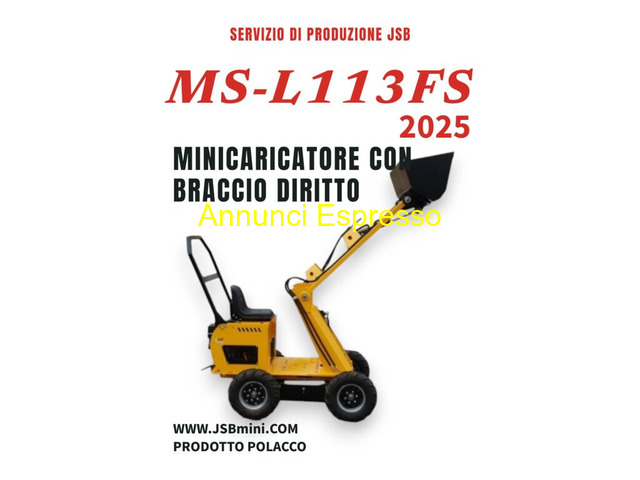 Caricatore-escavatore altro MINI PALA GOMMATA CON BRA prezzo EUR.7.035,00 Minipala gommata con braccio dritto MS-L113FS JSB Prezzo: 7035 EURO netti - potenza e versatilit? affidabili in una versione compatta! Caratteristiche tecniche: - Anno di produzione: 2025 - Dimensioni: L x L x A - [NUM]*) mm x 2300 mm x 1650 mm - Peso: 640 kg - Temperatura di funzionamento: Da -10?C a +45?C - Potenza: 13-15 CV / 10, 5 CV - Carburante: benzina / diesel - Capacit? della benna: 150 litri - Altezza di sollevamento: 160 cm (opzionale 200 cm) - Impianto idraulico: capacit? di lavoro 20 l/min, 160 bar, 2200 giri/min. - Uscita idraulica: per martello, trapano, betoniera, spazzatrice, falciatrice, ecc. - Garanzia: 12 mesi Castel d\'ario (MN)