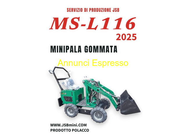 Caricatore-escavatore altro MINI PALA GOMMATA MS-L116 prezzo EUR.7.035,00 Caratteristiche tecniche della mini pala gommata MS-L116: - Anno di produzione: 2025 - Dimensioni: larghezza x lunghezza x altezza - 1040 mm (940 mm*) x 2300 mm x 1650 mm - Peso: 640 kg - Temperatura di esercizio: da -10?C a +45?C - Motore: Lifan 16 CV Pb95 (diesel opzionale) - Potenza: 13-15 CV (10, 5 kW) - Carburante: benzina Pb95 / diesel - Equipaggiamento standard: o Benna di carico con larghezza di 100 cm e capacit? di 150 litri o Uscita idraulica per l'azionamento di un martello o di un impianto di perforazione - Parametri operativi: o Altezza di sollevamento: 160 cm (200 cm*) o Capacit? di abbassare la benna nella trincea: fino a -30 cm o Impianto idraulico di produzione polacca: capacit? 20 l/min, pressione 160 bar, velocit? 2200 giri/min. - Garanzia: 12 mesi Opzioni aggiuntive: - Moderne luci di lavoro a LED - Motore diesel da 11, 5 CV - Rimorchio per il trasporto di attrezzature e macchina (categoria ?B?) Accessori opzionali disponibili: - Alimentatore Castel d\'ario (MN)