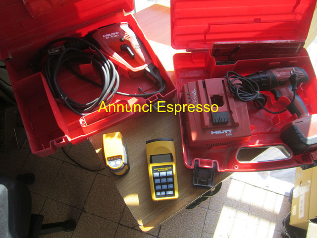 AVVITATORI-TRAPANO HILTI BATTERI&ELETTR +SCALA HILTI prezzo EUR.370,00 ACQUISTATO PER UN LAVORO IN UNA IMMOBILE PRIVATO? VENDO ATTREZZI HILTI -IDEALE PER MONTATORI DI CARTONGESSO PARLIAMO DI UN AVVITATORE PROFESSIONALE DA 220 VOLT CON FILO CORRENTE ULTRA LEGGERO E MANEGGEVOLE PER AVVITARE VITI CARTONGESSO + UN TRAPANO AVVITATORE A BATTERIE DA 14 VOLT HILTI +UNA SCALA ULTRA LEGGERA DI ALLUMINIO ALLUNGABILE COME NUOVA TRASFORMABILE A 4 6 M + UN LASER PORTATILE A LINEA INFRAROSSI TUTTO IL MATERIALE E IN OTTIME CONDIZIONE E STATO USATO PER 3 CONTRO-SOFFITTA IN IMMOBILE-ESPOSIZIONE AUTO VENDO SOLO IN BLOCCO AD 370 INTRATTABILE ( N. B SOLO L AVVITATORE A 220 VOLT COSTA 430 EURO). . . . . N. B IL MATERIALE E VENDIBILE SOLO IN BLOCCO -NO SINGOLO IL PREZZO E QUELLO INDICATO EVITATE OFFERTE A RIBASSO . . . POSSIBILE SPEDIZIONE IN TUTTA ITALIA. . . NON IN CONTRASSEGNO . . . INFORMAZIONE SOLO CONTATTO VOCALE Set di attrezzi professionali con trapano, caricabatterie, cavi, e misuratore elettronico. Valigette rosse incluse. Usato. Marca non indicata. Napoli (NA)