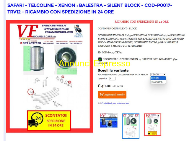 Ammortizzazione Sospensione Tata Telcoline SAFARI-TELCOLINE-XENON BALESTRA - SILENT BLOCK prezzo EUR.40,00 Spedizione Si Spese spedizione 15 Motore Tata Xenon SAFARI-TELCOLINE-XENON DISTRIBUZIONE 2. 2 DICOR - KIT SERIE MODIFICA \" E \" prezzo EUR. 410, 00 Spedizione Si Spese spedizione 15 Altro Tata Safari XENON 2. 2 DICOR Pompa Gasolio Tata Safari e Telcoline prezzo EUR. 350, 00 Spedizione Si Spese spedizione 15 Ricambi per Tata Safari Xenon Pick Up Telcoline Indica Indigo Aria Vista, con motore 483DLTC49 483DLTC55 Dicor e Fire. Braccetti e testine sterzo Testata Iniettori Pompa Gasolio Servofreno Semiassi Pompa Freni Pompa Acqua Pompa Frizione Pompa Sterzo Pedane esterne Radiatore Scatole Sterzo Alzacristalli Impianto Scarico Fumi Cambio Motorino attuatore 4WD Albero Trasmissione Ponte differenziale Paraurti Fari Fanalini Retronebbia Fendinebbia Parafango Parabrezza Lunotto Monoblocco nudo o completo di albero motore e pistoni Turbo Sedili Quadro strumenti Motori nudi o completi di accessori. Ogni altro ricambio visibile anche nel nostro sito web shop. Tutti i ricambi sono garantiti sei mesi con sostituzione o rimb Reggio Calabria (RC)