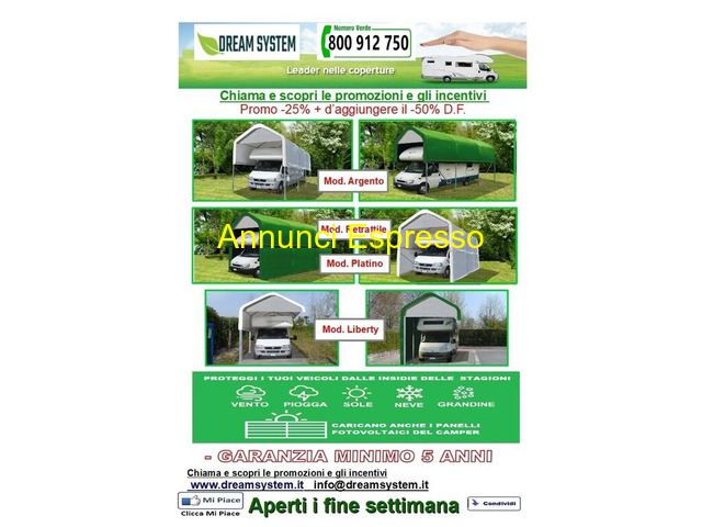 Box caper Promo -25%- 50%df Coperture per camper www.DreamSystem.it prezzo EUR.255,00 La Dream System realizza coperture box per Camper e auto in vari soluzioni e modelli, dalle coperture per Camper e auto classiche, alle coperture retrattili o coperture a braccio per Auto e coperture a braccio per camper . Le coperture sono in vari modelli e soluzioni: per i privati o coperture per rimessaggi camper, per piazzali di concessionarie d'auto o camper, autoparchi o autolavaggi o condominiali. Le coperture possono essere in Pvc per neve e grandine o coperture antigrandine per auto e automezzi . Chiama e fatti consigliare la soluzione migliore per te. N. Verde [NUM] Visita il sito www. dreamsystem. it Vicenza (VI)