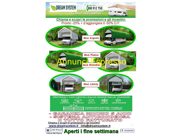 Box caper Promo -25%+50% Coperture camper e auto www.DreamSystem.it prezzo EUR.255,00 Studiamo e realizziamo coperture per Camper, Coperture per auto, per vari esigenze e clientela, dai Privati , alle aziende . Le soluzioni possono essere Coperture retrattili per Camper o auto , Coperture a braccio per Camper o auto , Coperture a braccio per autolavaggi o condomini, Coperture per Piazzali o Coperture per rimessaggi Camper auto o Barche. Abbiamo varie offerte di Copertura per Camper e per auto con le più svariate esigenze. Le coperture possono essere in PVC per neve-Grandine-Vento o Coperture antigrandine per piazzali di concessionarie. Presenti in tutta Italia con le consegne , Consegna direttamente a casa tua, isole comprese. Chiama il N. Verde [NUM] per la soluzione per te. Visita il sito www. dreamsystem. it Treviso (TV)