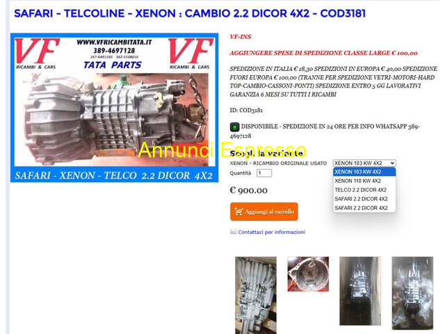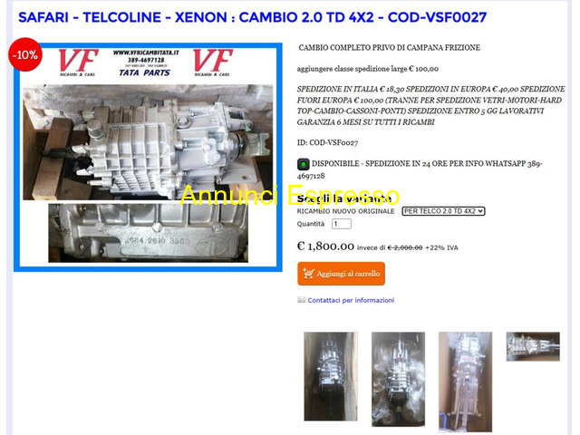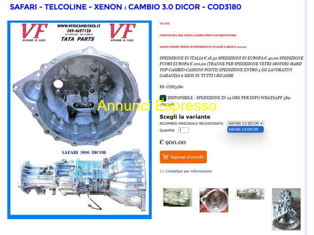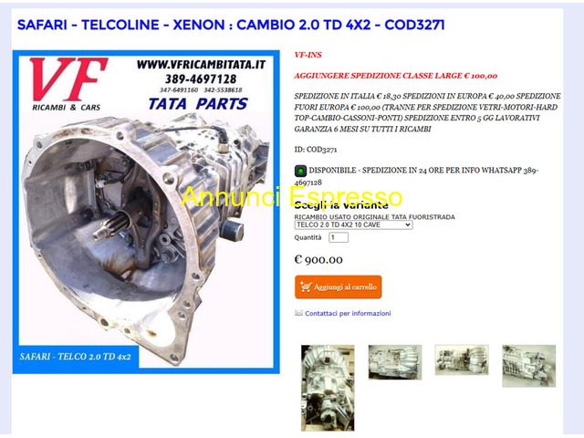 Cambio Tata Telcoline SAFARI-TELCOLINE-XENON CAMBIO 2.0 TD- 3.0 DICOR 4X2 - 4X4 prezzo EUR.900,00 Spedizione Si Spese spedizione 15 SAFARI - TELCO - XENON - CAMBIO E TRASMISSIONE - ARIA CONDIZIONATA - MOTORE - PARTI ELETTRICHE DEL MOTORE - CARROZZERIA ESTERNA - FRIZIONE - IMPIANTO SCARICO FUMI - TERGICRISTALLI - VETRI E GUARNIZIONI - CERCHI RUOTE - DISTRIBUZIONE CINGHIE E GUARNIZIONI - FILTRI - FRENI DISPONIBILI TUTTI I RICAMBI ORIGINALI DEL GRUPPO TATA Sassari (SS)