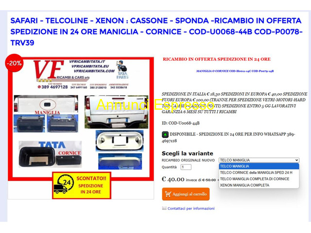 Carrozzeria Tata Telcoline SAFARI-TELCOLINE-XENON CASSONE - SPONDA - MANIGLIA O CORNICE prezzo EUR.40,00 Spedizione Si Spese spedizione 15 MANIGLIA O CORNICE SPEDIZIONE IN ITALIA € 18, 30 SPEDIZIONI IN EUROPA € 40, 00 SPEDIZIONE FUORI EUROPA € 100, 00 (TRANNE PER SPEDIZIONE VETRI-MOTORI-HARD TOP-CAMBIO-CASSONI-PONTI) SPEDIZIONE ENTRO 5 GG LAVORATIVI GARANZIA 6 MESI SU TUTTI I RICAMBI DISPONIBILI TUTTI I RICAMBI ORIGINALI TATA Prato (PO)