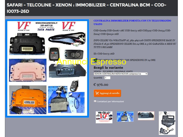 Impianto elettrico Tata Xenon SAFARI-TELCOLINE-XENON IMMOBILIZER - CENTRALINA BCM - COD-I0073-26D prezzo EUR.800,00 Spedizione Si Spese spedizione 15 Centralina BCM per veicoli, immobilizer, componenti elettrici, vari modelli inclusi. Prezzo 800, 00 euro. Adatta per riparazioni e sostituzioni. Crotone (KR)