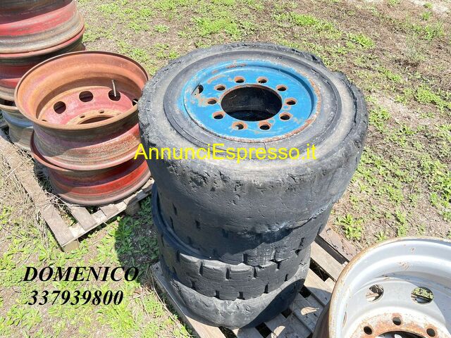 N.4 GOMME PIENE X MULETTO MISURE 250-15 CERCHIO 10 IVECO prezzo EUR.100,00 INFO: DOMENICO [NUM] GRAZIE N. 4 GOMME PIENE X MULETTO MISURE 250-15 CON CERCHIO 10 FORI Gomma utilizzata con cerchione blu, in buone condizioni. Diverse ruote e cerchioni di metallo visibili sullo sfondo. Ideale per riparazioni o ricambi. Contatto: Domenico, [NUM]. Andria (BT)