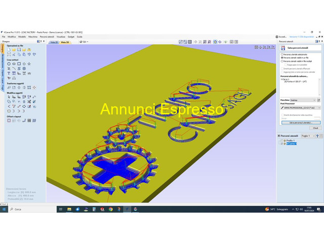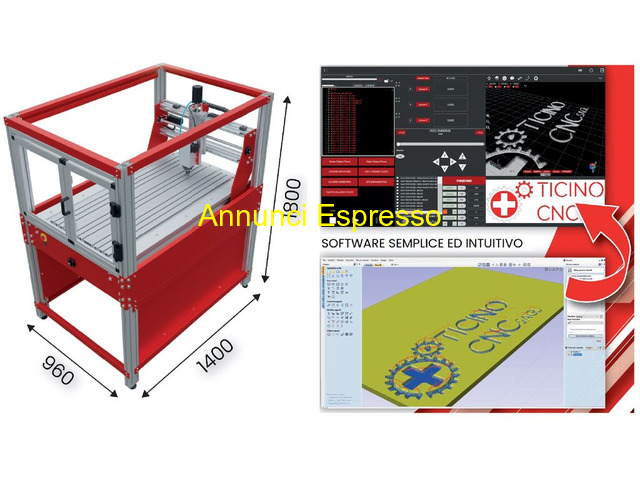 Pantografo cnc, fresatrice corse 600x1010x140mm Ticino cnc prezzo EUR.7.500,00 PRONTA CONSEGNA ! Il MOD. CH0510 ? un pantografo cnc professionale dalle dimensioni compatte, ma si distingue per la sua robusta semplicit? e convenienza. E' possibile lavorare con utensili sia a secco che con lubrificazione umida poich? la macchina, di serie, ? dotata di una vasca di raccolta sottostante al piano di lavoro. Le prestazioni sia dell'elettronica che della meccanica sono notevolmente migliorate rispetto a macchine simili e consente lavorazioni su 3 assi in continuo. La CH0510 si rivela un eccellente strumento per i vostri progetti di lavorazione su alluminio, legno, plexiglass, forex e dibond, garantendo ottimi risultati anche nei progetti pi? complessi. CNC fresatrice rossa, ideale per lavorazioni su legno e altri materiali. Piano di lavoro ampio e stabile. Ottima per hobbisti e professionisti. Macchina CNC per fresatura, dimensioni 1400x980x1800 mm, software intuitivo incluso. Ideale per lavorazioni precise su vari materiali. Campochiaro (CB)