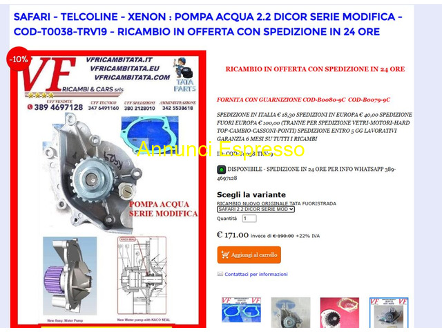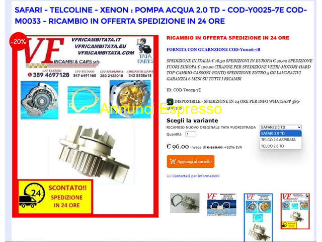 Motore Tata Xenon SAFARI-TELCOLINE-XENON POMPA ACQUA 2.2 DICOR SERIE MODIFICA prezzo EUR.171,00 Spedizione Si Spese spedizione 15 RICAMBIO IN OFFERTA CON SPEDIZIONE IN 24 ORE FORNITA CON GUARNIZIONE DISPONIBILI TUTTI I RICAMBI ORIGINALI DEL GRUPPO TATA Roma (RM)