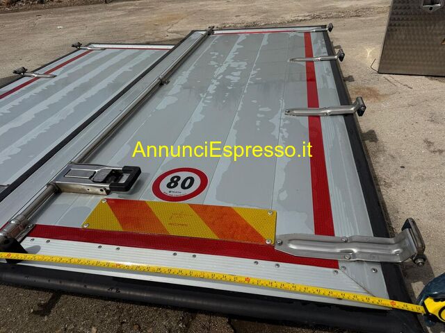 PORTE POST. E CASSETTONE PER AUTOCARRO CENTINATO IVECO prezzo EUR.100,00 X INFO: DOMENICO [NUM] GRAZIE PORTE POST. IN ALLUMINIO PER AUTOCARRO CENTINATO MISURE: ALTEZZA MT. 2. 80, LARGHEZZA MT. 2. 55 CASSETTONE IN ACCIAO INOX MISURE: PROFONDITA' CM. 70, LARGHEZZA CM. 53, LUNGHEZZA MT. 1. 70 Porte in metallo per rimorchio, con riflettori e numeri di limitazione di carico. Buone condizioni, pronte all'uso. Dimensioni e dettagli specifici non visibili. Ideali per trasporto merci. Informazioni di contatto incluse. Andria (BT)