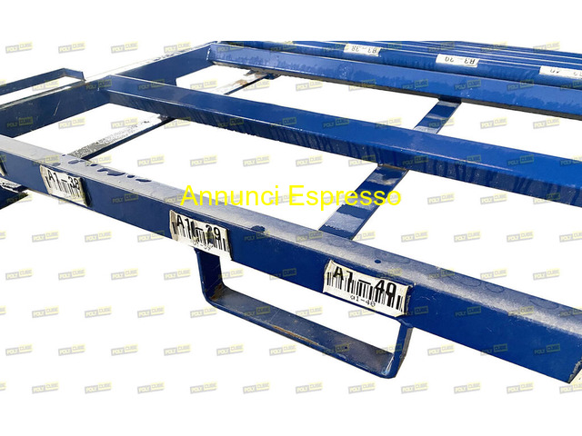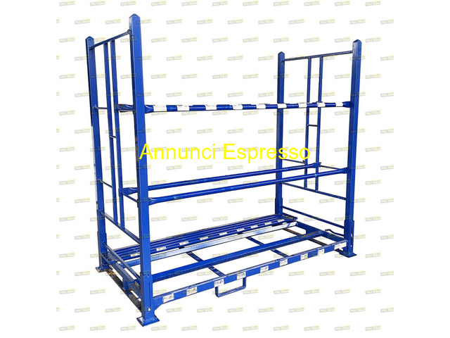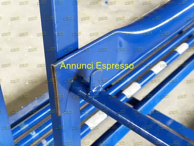 Scaffali mobili usati e ripiegabili per pneumatici arcom prezzo EUR.1.111,00 Contenitori rack o scaffali mobili usati, marca Arcom modello AR05MIX, ripiegabili per lo stoccaggio verticale degli pneumatici per auto e SUV con misure da 480 a 790 mm: impilabili fino a 4 livelli per ottimizzare al massimo lo spazio nel magazzino; dotati di barre in acciaio posizionabili liberamente sulle fiancate per adattare lo stoccaggio delle diverse misure. Misure: mm 2383 X 1250 H2200 chiusi mm 375. Lotto di OTTIMA QUALITA?: possibili e limitatissimi segni di ruggine superficiale, il tutto come da documentazione fotografica. Proposta salvo il venduto da Polycube srl, prezzo su richiesta, sconti per quantità; ulteriori foto e dettagli sul mostro sito. Possibilità di gestione della spedizione. Struttura metallica blu per stoccaggio, robusta e resistente. Design modulare con superiore e inferiore. Ideale per organizzazione magazzino o industria. Facile da assemblare e posizionare. Dimensioni standard, adatta per carichi pesanti. Poppi (AR)