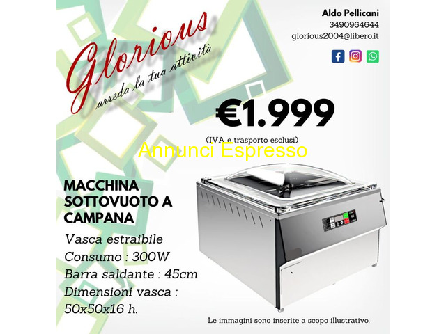 sottovuoto a campana glorious prezzo EUR.1.999,00 Macchina sottovuoto a campana, 300W, barra saldante 45cm, dimensioni 50x60x16cm, prezzo 1999 euro, IVA e trasporto esclusi. per info Ruvo di Puglia (BA)