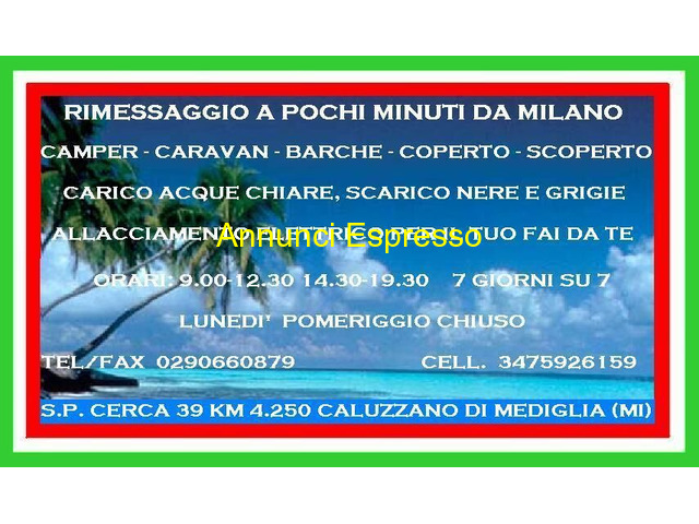Rimessaggio 2026 Camper Roulotte Nautica prezzo EUR.550,00 Rimessaggio Camper Roulotte Nautica carrelli prezzo EUR. 550, 00 /Benvenuti alla Ei Vamos Anno /2026 in un luogo adeguato Ricordiamo un Rimessaggio *ABUSIVO *(privo del Registro autorizzazioni della POLIZIA MUNICIPALE ¨ soggetto al Sequestro di Tutti i mezzi in giacenza Rimessaggio a pochi minuti da Milano. Servizi per camper, caravan, barche. Carico acqua, scarico nere e grigie. Allacciamento elettrico per pulizia del vostro mezzo . Apertura . 7gg su 7. Caluzzano di Mediglia, Cap 20076 MI. Mediglia (MI) Mediglia (MI)